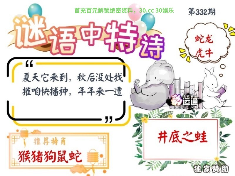 335期谜语中特诗:【指桑骂槐】 左看马靠它,右看它靠马 左右一齐看,脚踩万里沙 解:左看马靠它解左肖牛鼠鸡猴蛇龙 五肖:牛鼠鸡猴蛇 四肖:牛鼠鸡猴 三肖:牛鼠鸡 二肖:牛鼠 一肖:牛 |